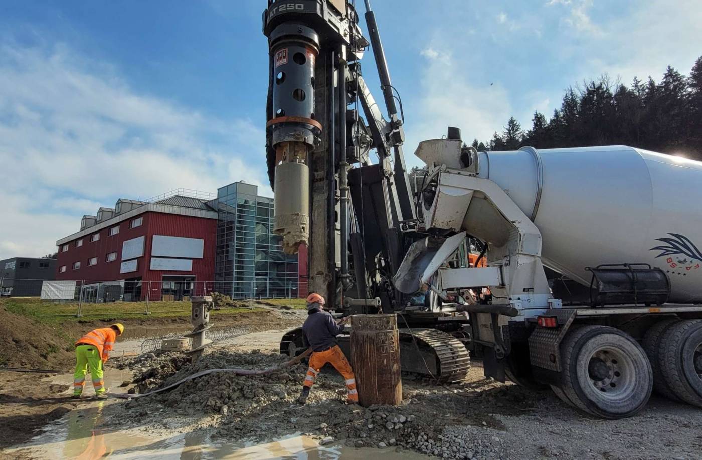 Die Room4u AG erweitert in Elsau ihr Sortiment um eine weitere Lagerhalle. Das Projektareal umfasst eine Gesamtfläche von ca. 4'800 m2. Um ideale Kenntnisse über den Baugrund zu erhalten hat die AllGeol AG 4 Baggersondierungen und 6 Rammsondierungen durchgeführt. Aufgrund des zu erwartenden hohen Grundwasserspiegels wurden zudem zwei Sickerrohre versetzt und jeweils mit einer Drucksonde mit Datenlogger zur Überwachung der Grundwassserschwankungen ausgestattet. Die gewonnenen Erkenntnisse wurden in einem geologischen Bericht zusammengefasst. Aufgrund der hohen Lasten des Gebäudes und der relativ grossen Mächtigkeit der schlecht tragfähigen Schichten wurde die Fundation der Werkhalle mittels Bohrpfählen bewerkstelligt. Die AllGeol AG hat das Erstellen der ersten Bohrpfähle begleitet.